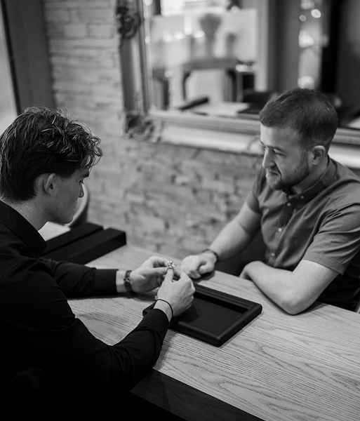 Bring your jewellery to our Poynton studio for a complimentary clean and light polish to restore its sparkle. For deeper restoration, our full refurbishment service removes scratches and imperfections, reviving your piece’s original brilliance.